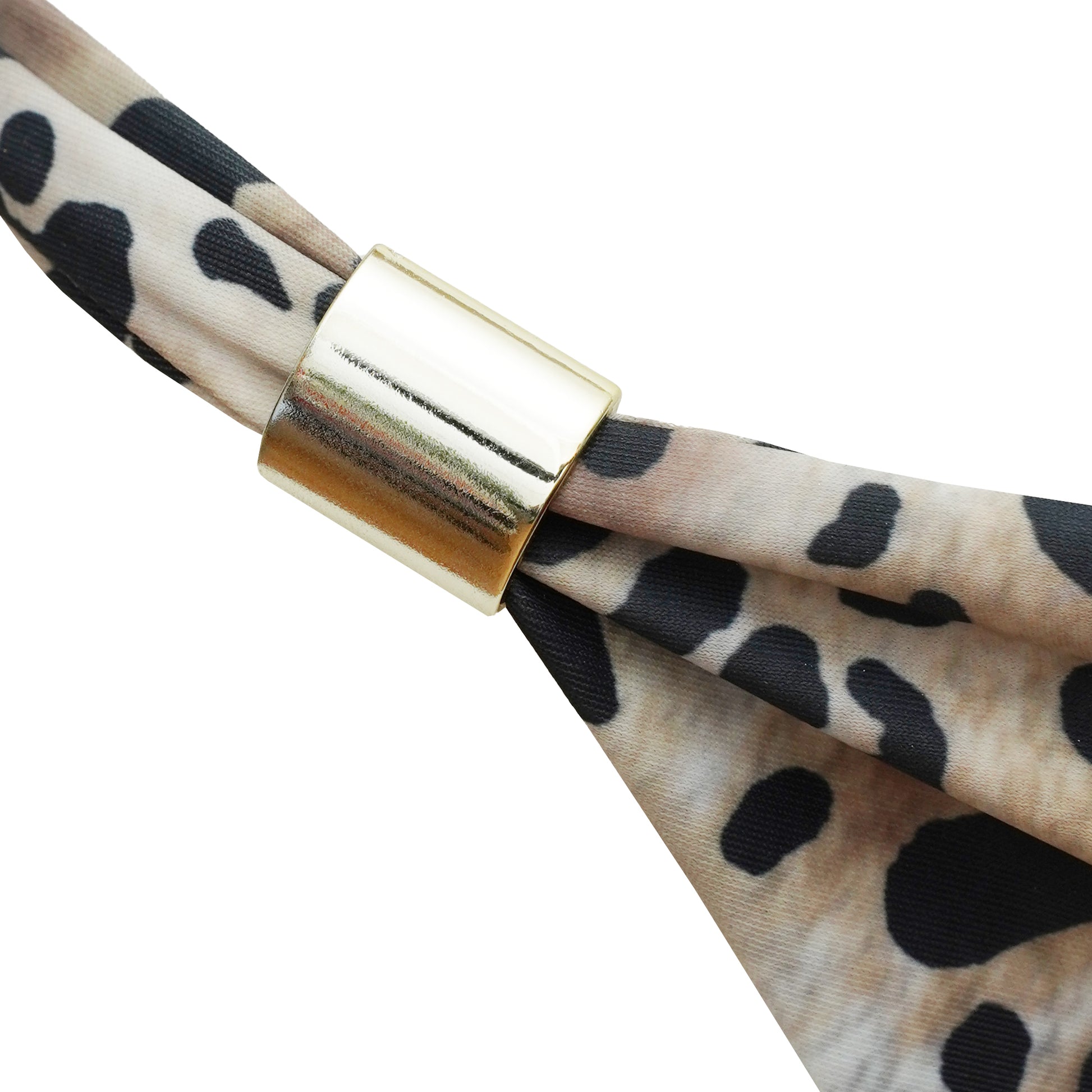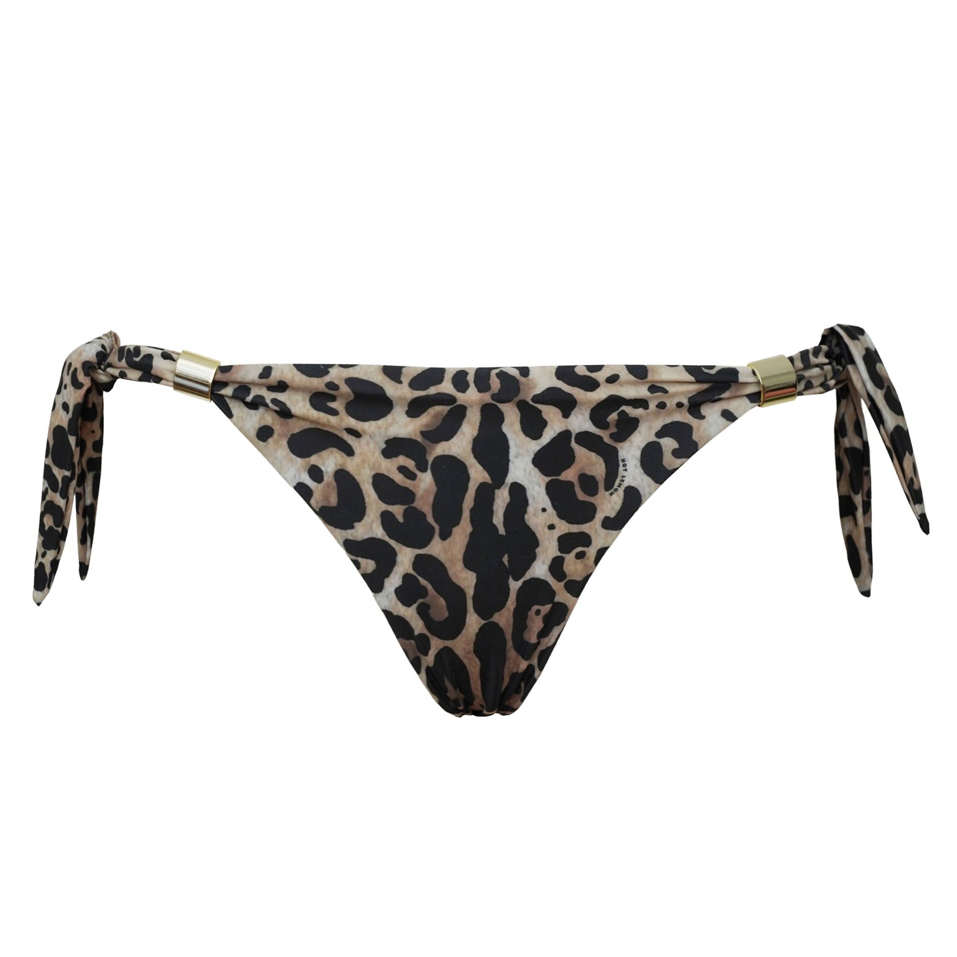 Complete your look with these leopard-print bikini bottoms, featuring adjustable side ties for a custom fit and a flattering silhouette. The nickel-free accessories, treated for heat and seawater resistance, add a subtle touch of elegance that’s perfect for sun-soaked days.