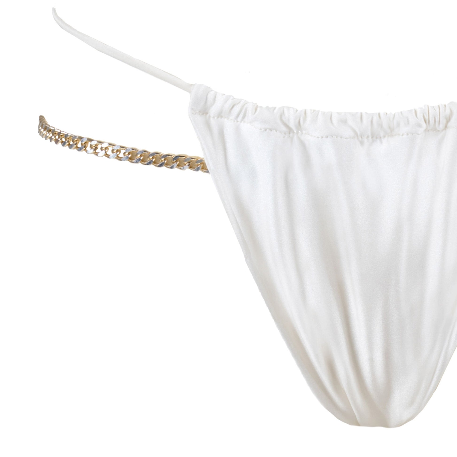 Bikini bottom features a side tie with medium-high waist. The fabric is soft and satin effect.