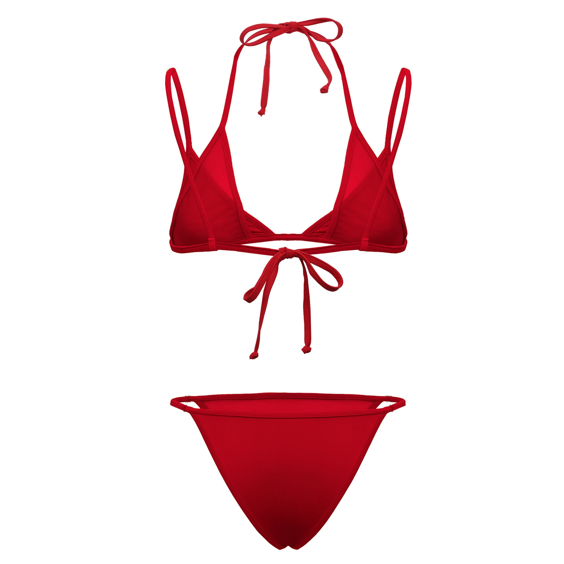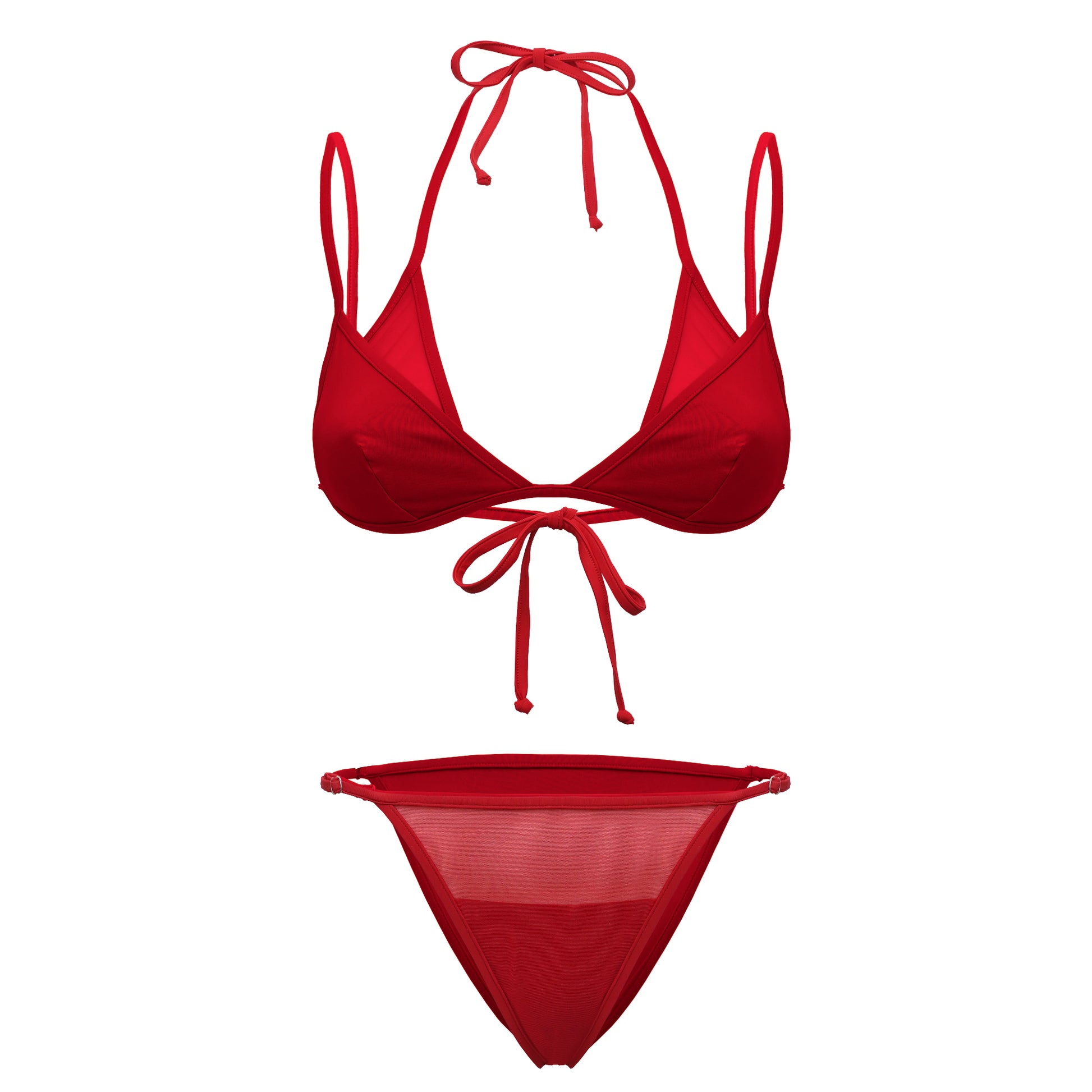 Double triangle in tulle and lycra with laces. The briefs have adjusters on the sides with a play of transparencies in tulle and lycra.