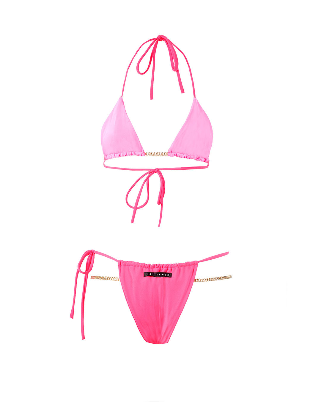 Make every beach day unforgettable with this Italian-designed triangle bikini — where sensual style meets perfect fit. The shimmering chain detail at the neckline adds a touch of glamour, yet stays cool under the sun. Treated with an anti-oxidation finish, it’s made to shine beautifully in saltwater without losing its luster.